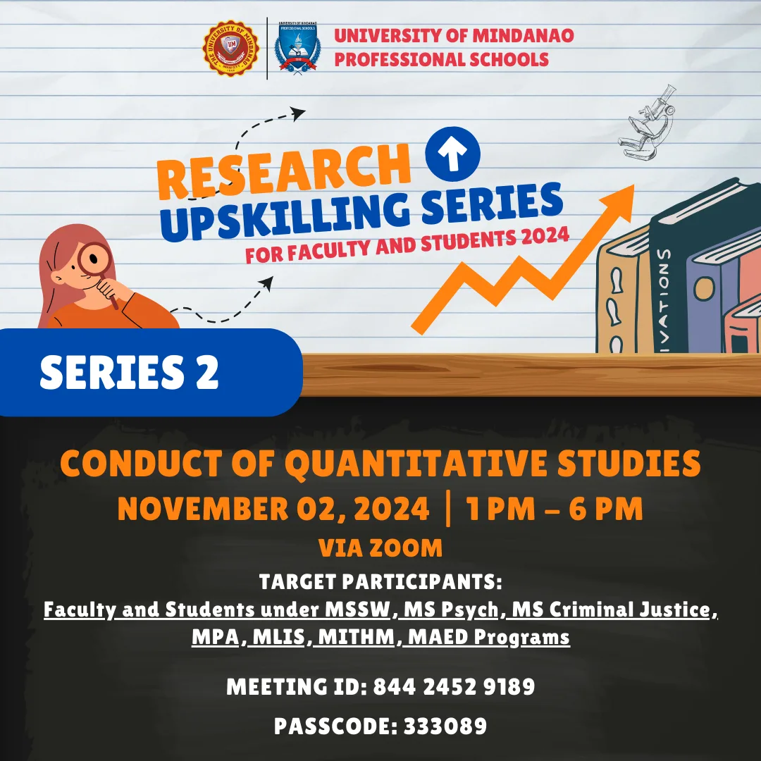 The University of Mindanao (UM) Professional Schools conducted the second installment of its Research Upskilling Series for Faculty and Students 2024 via Zoom teleconferencing on November 2, 2024. With the topic “Conduct of Quantitative Studies,” the session aimed to strengthen the research competencies of faculty members and graduate students.